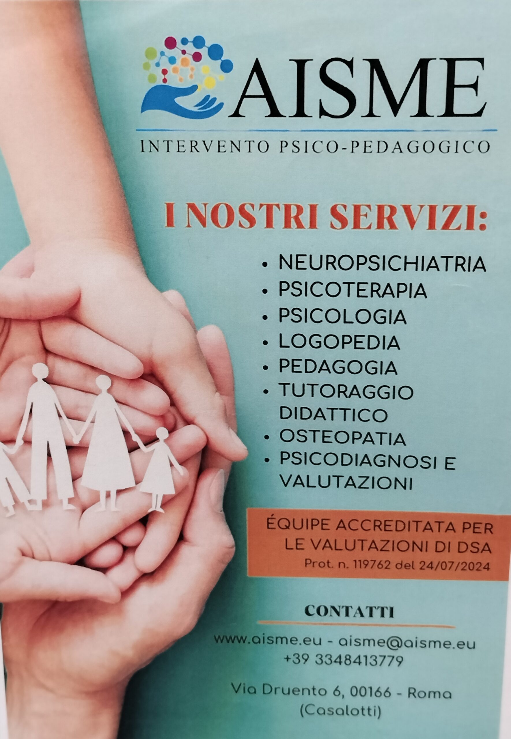 Lo Studio AISME opera a Roma dal gennaio 2000, svolgendo diversi servizi rivolti a promuovere il benessere della persona, dall’infanzia all’età adulta, e attività di formazione in ambito scolastico, socioeducativo e aziendale.